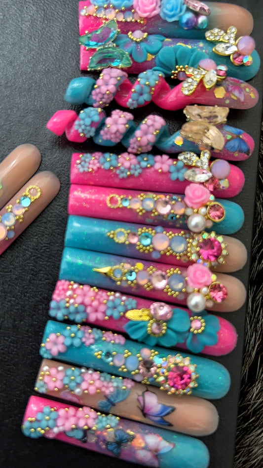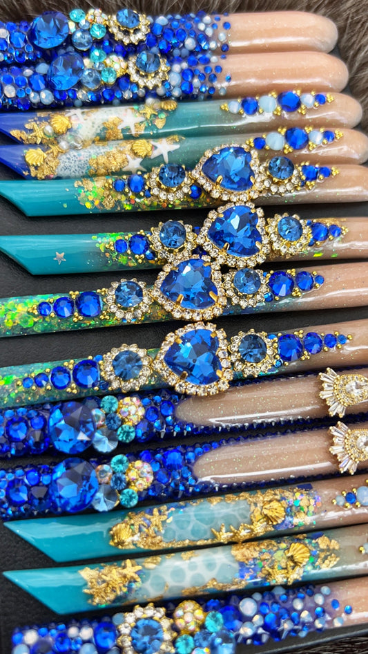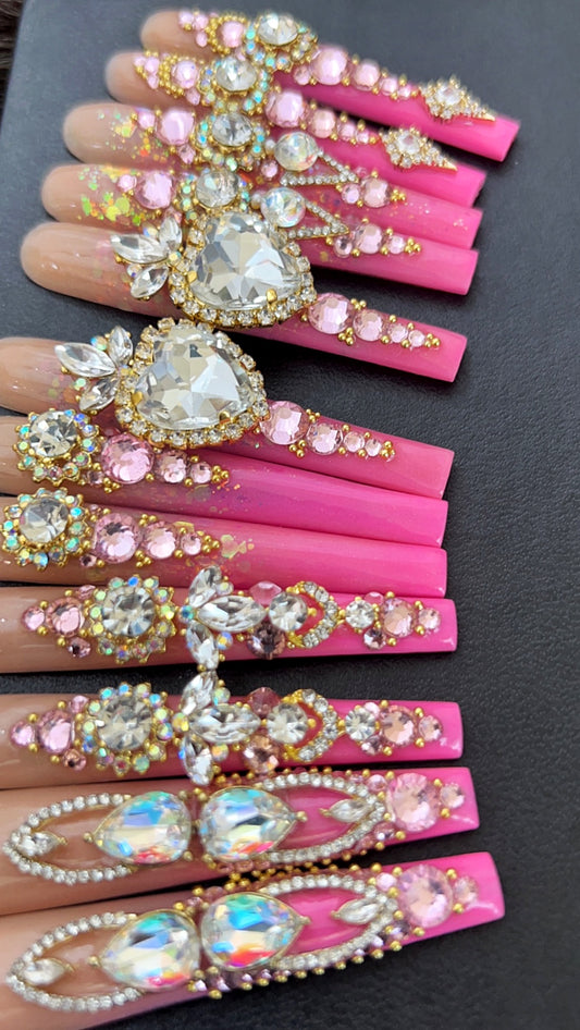 "These nails are absolutely beautiful and amazing quality. The shop owner was amazing and responded to my questions super fast and was always kind!! They even gave me an extra set of nails which are also amazing. These are some amazing quality nails and would definitely recommend anyone looking for long nails with glam!!"