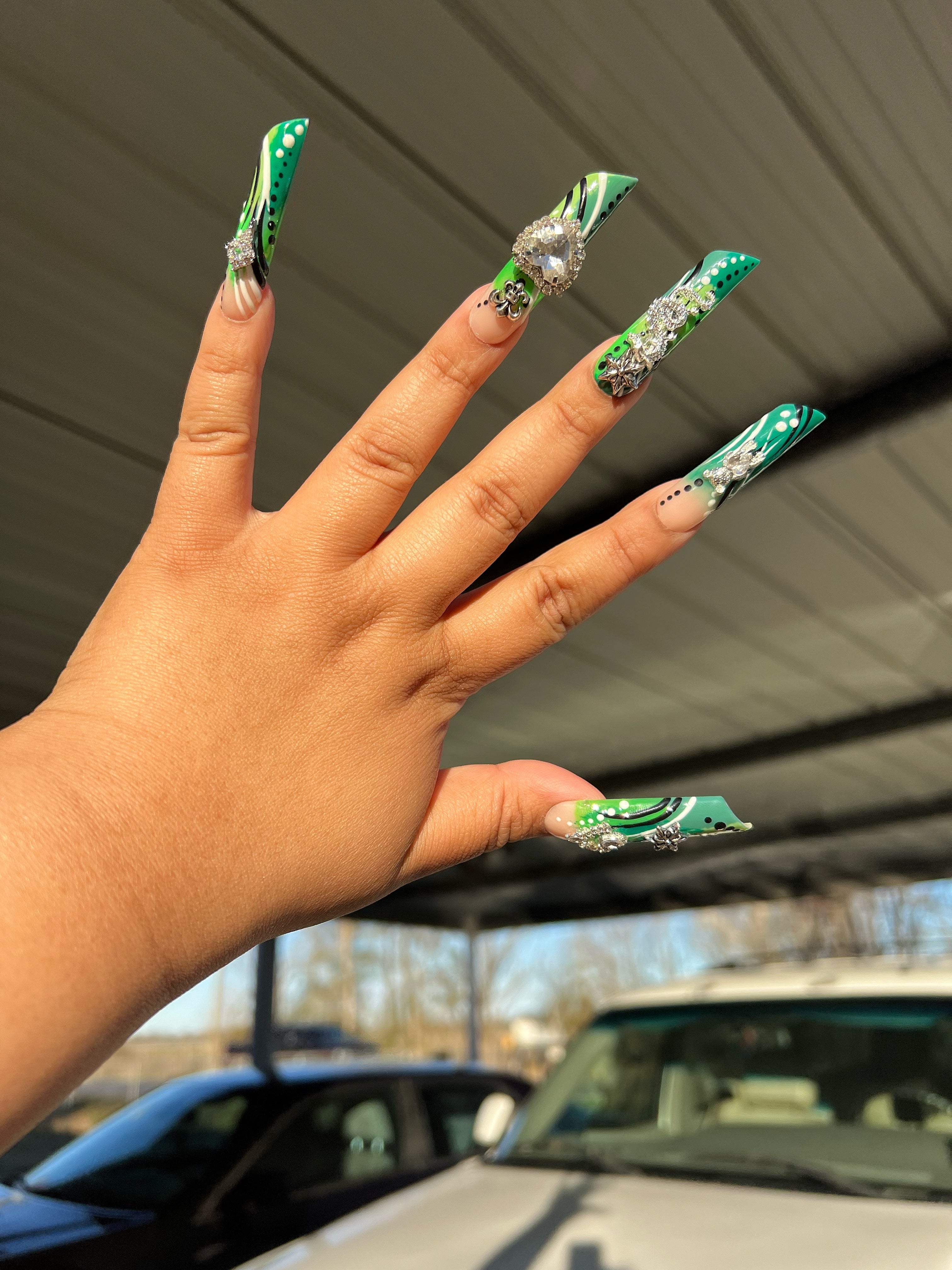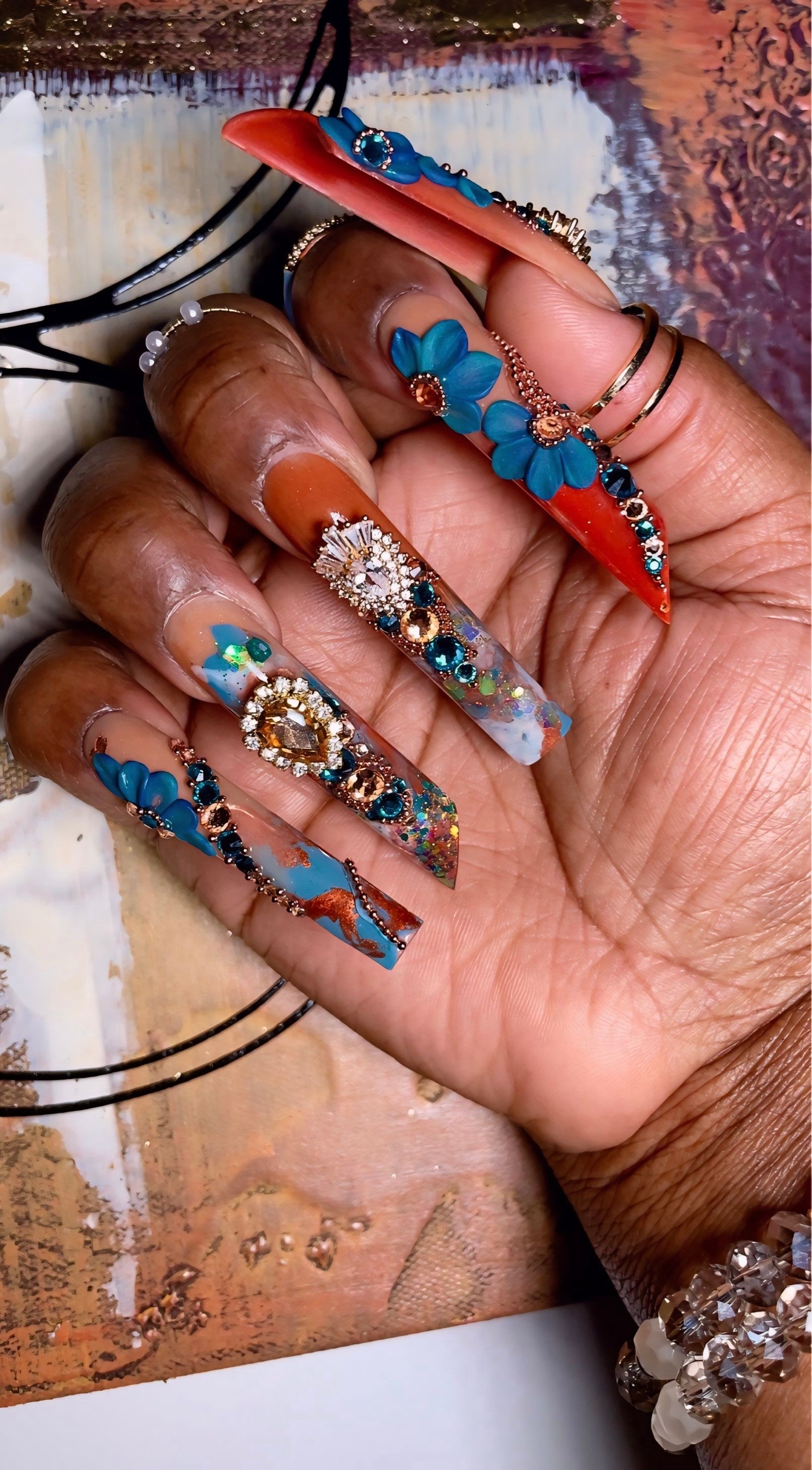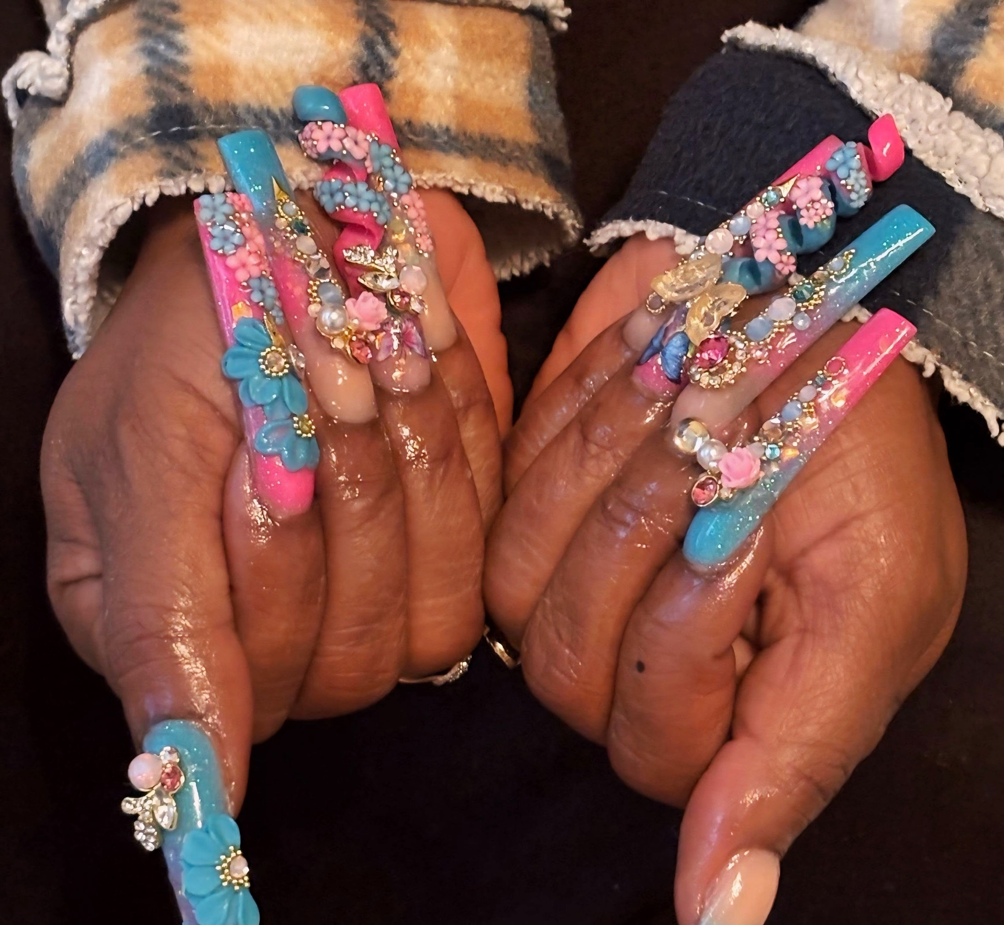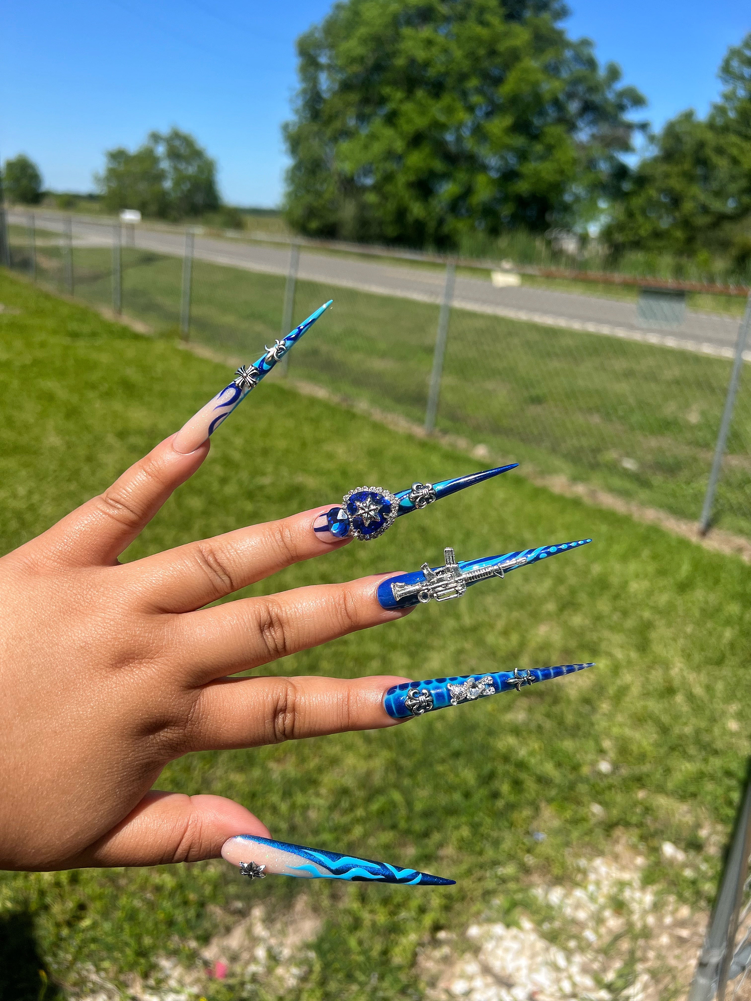 "These nails here were made for the GODS. I love it. Never seen nails like these and the picture don't do it no justice. Everybody notice my nails weather they were near or far hunny.She is such a talented nail artist. Anyone who is scare to buy, you have to make your move, you will be lock in with her after that."