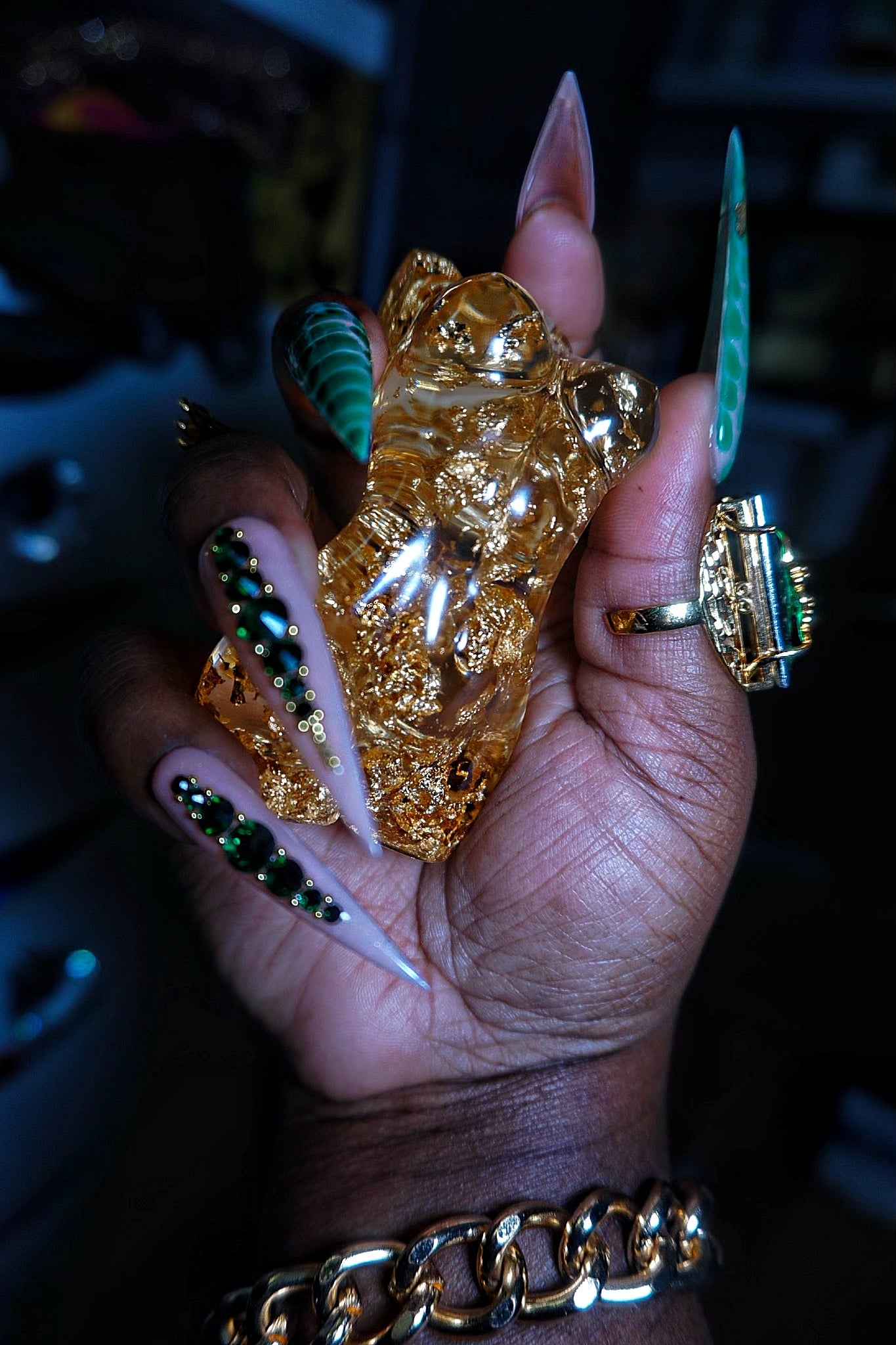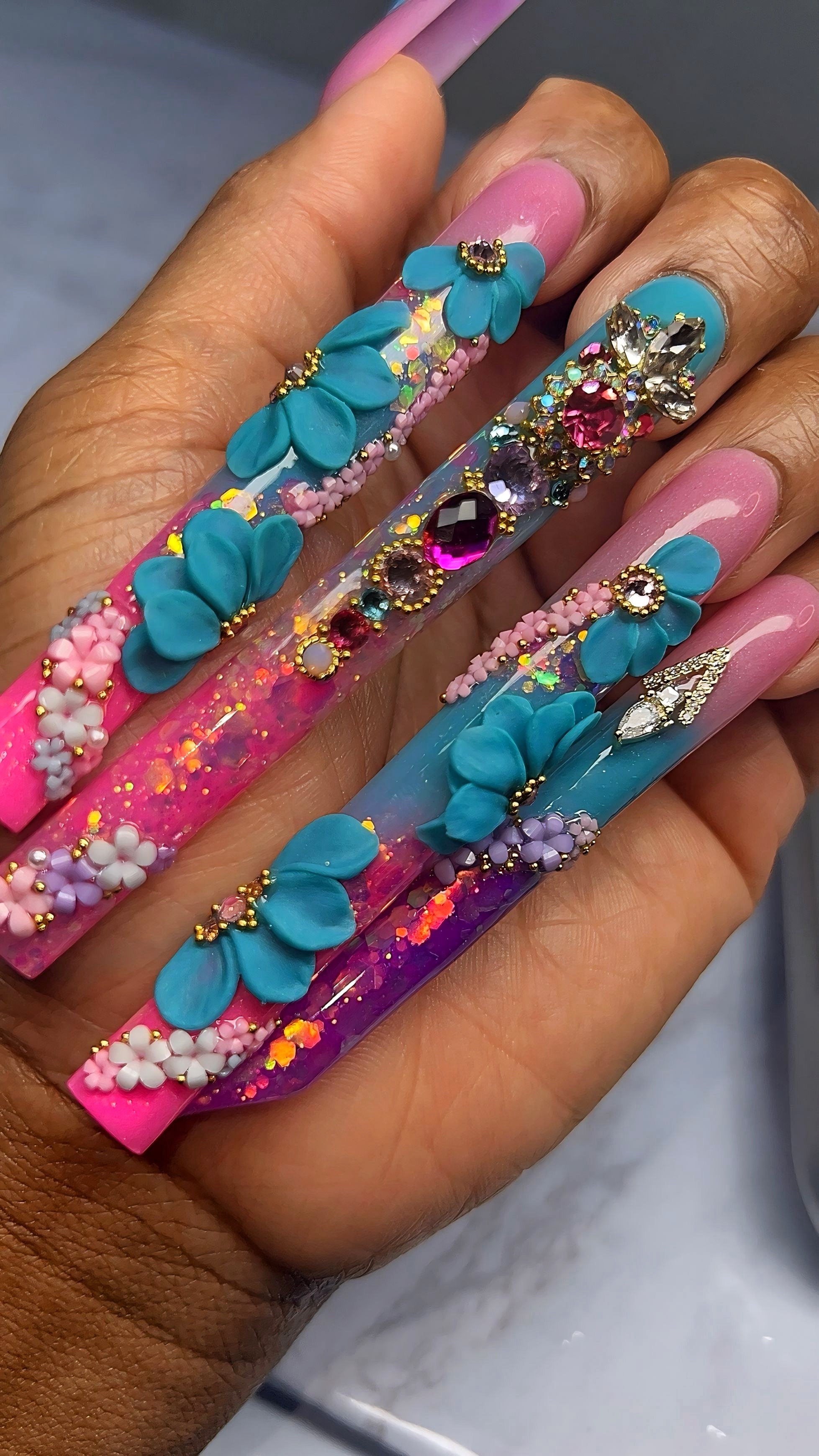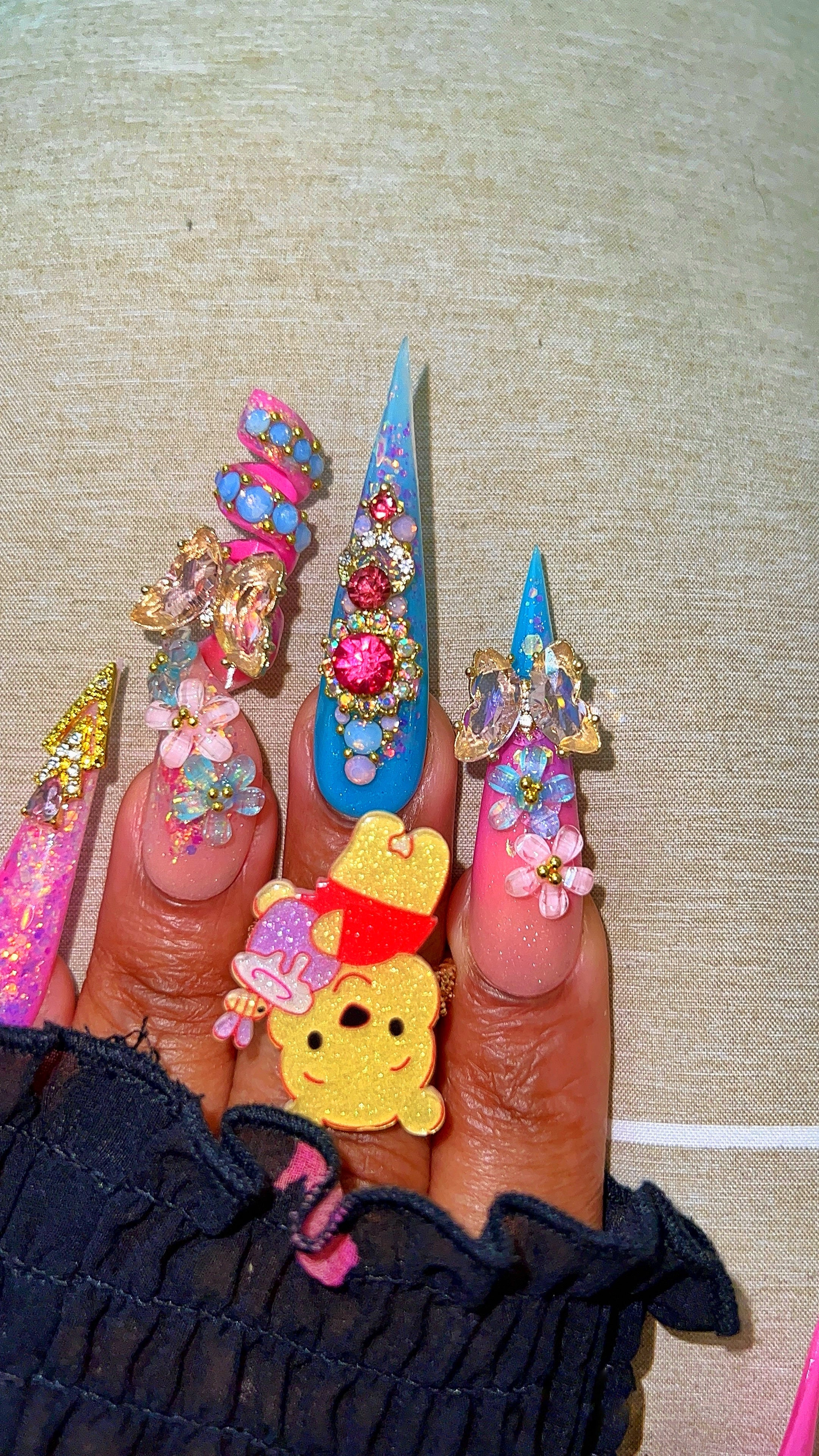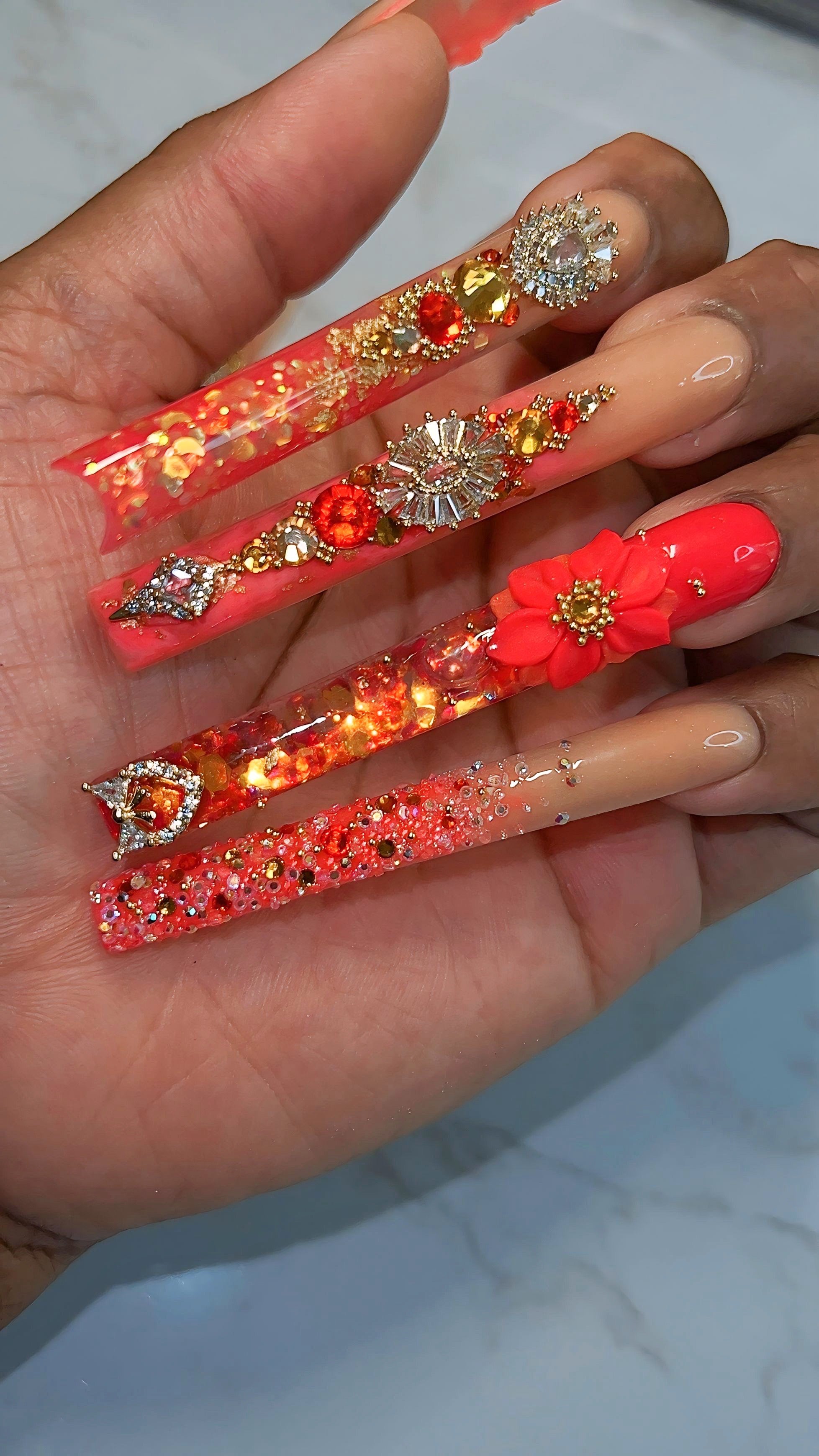 "These nails here were made for the GODS. I love it. Never seen nails like these and the picture don't do it no justice. Everybody notice my nails weather they were near or far hunny.She is such a talented nail artist. Anyone who is scare to buy, you have to make your move, you will be lock in with her after that."